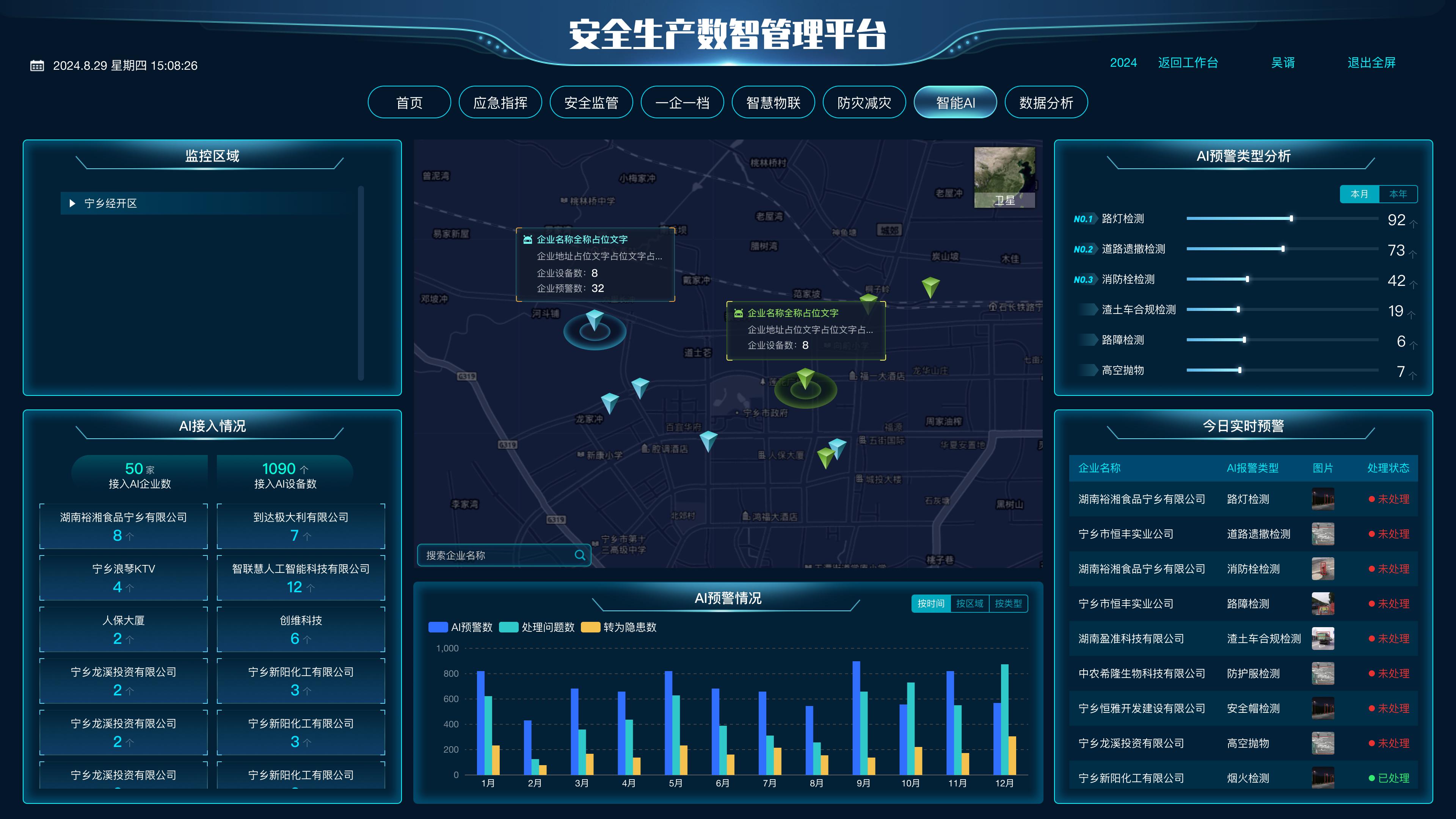 通過“智能AI”數(shù)據(jù)看板,隨時(shí)查看轄區(qū)內(nèi)各企業(yè)每日警情,AI預(yù)警情況,針對(duì)預(yù)警類型進(jìn)行智能統(tǒng)計(jì)分析,直觀展示每月每年高頻違規(guī)類型和數(shù)量。