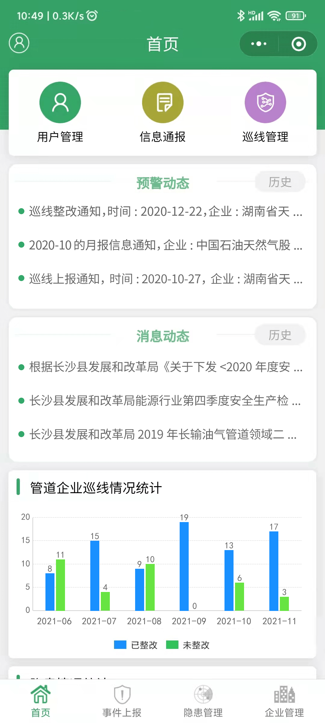 平臺(tái)配置了手機(jī)端小程序,安全監(jiān)管人員、鎮(zhèn)街人員、管道企業(yè)人員皆可通過小程序隨時(shí)開展日常管理工作,快速增強(qiáng)工作便利性,持續(xù)提升安全工作的信息化水平。