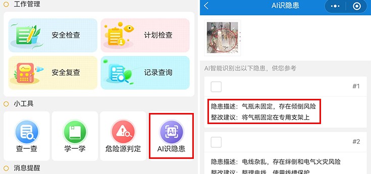 系統(tǒng)內(nèi)置“AI識隱患”功能,現(xiàn)場隱患圖片拍一拍,利用AI識圖一鍵出結(jié)果,對應(yīng)隱患描述、整改建議一目了然,安全小白也能輕松上手。自動生成隱患排查單,支持添加多條隱患、在線編輯、復(fù)制、刪除。