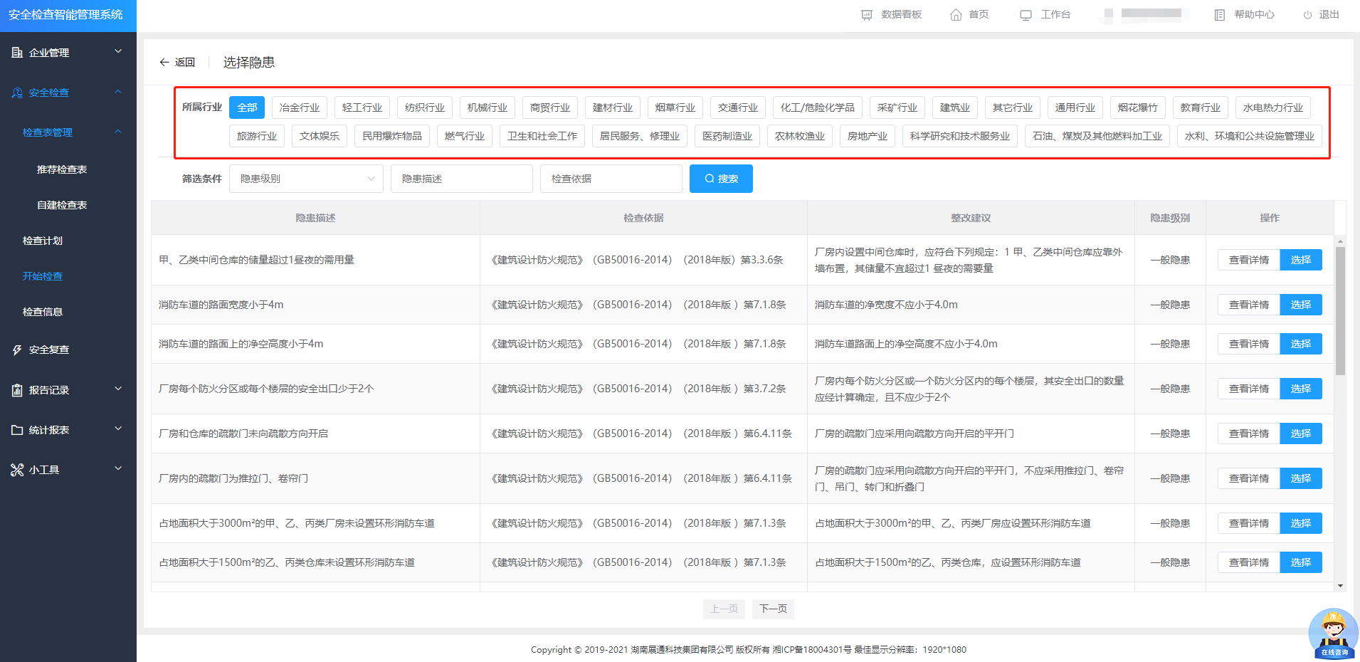 系統(tǒng)涵蓋了30個行業(yè),近400個專業(yè)的隱患數(shù)據(jù)庫。所有數(shù)據(jù)均依據(jù)國家現(xiàn)行法律法規(guī) 技術(shù)規(guī)范進(jìn)行深度挖掘,對應(yīng)隱患描述、檢查依據(jù)、整改建議、隱患級別等一目了然,安全檢查工作提供精準(zhǔn)規(guī)范的數(shù)據(jù)支撐。
