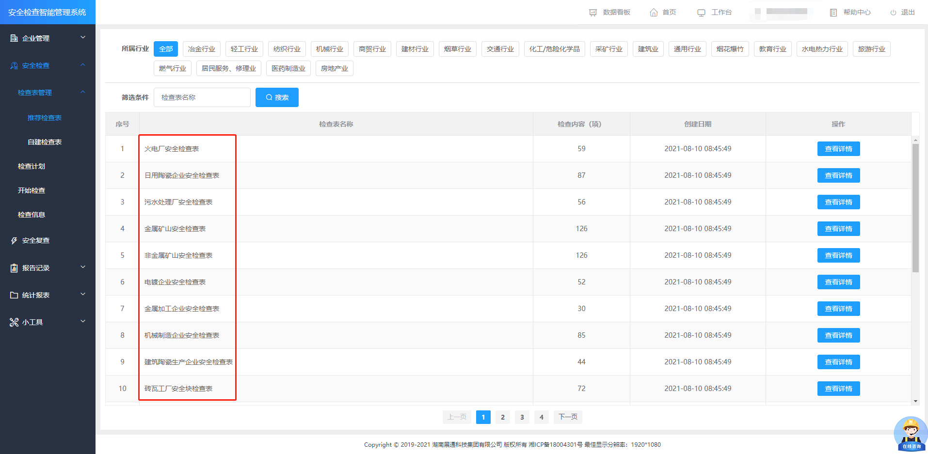 系統(tǒng)內(nèi)置“推薦檢查表”,涵蓋八大工貿(mào)、化工、建筑等多個行業(yè),可為安全檢查提供全面精準(zhǔn)的檢查項(xiàng)目,實(shí)現(xiàn)“清單式”檢查,有效解決問題點(diǎn)發(fā)現(xiàn)不全,檢查不全面等問題。