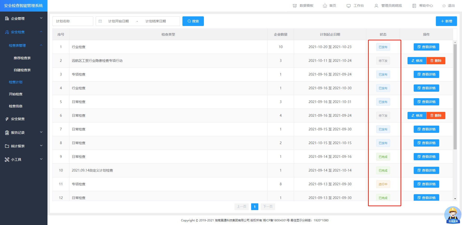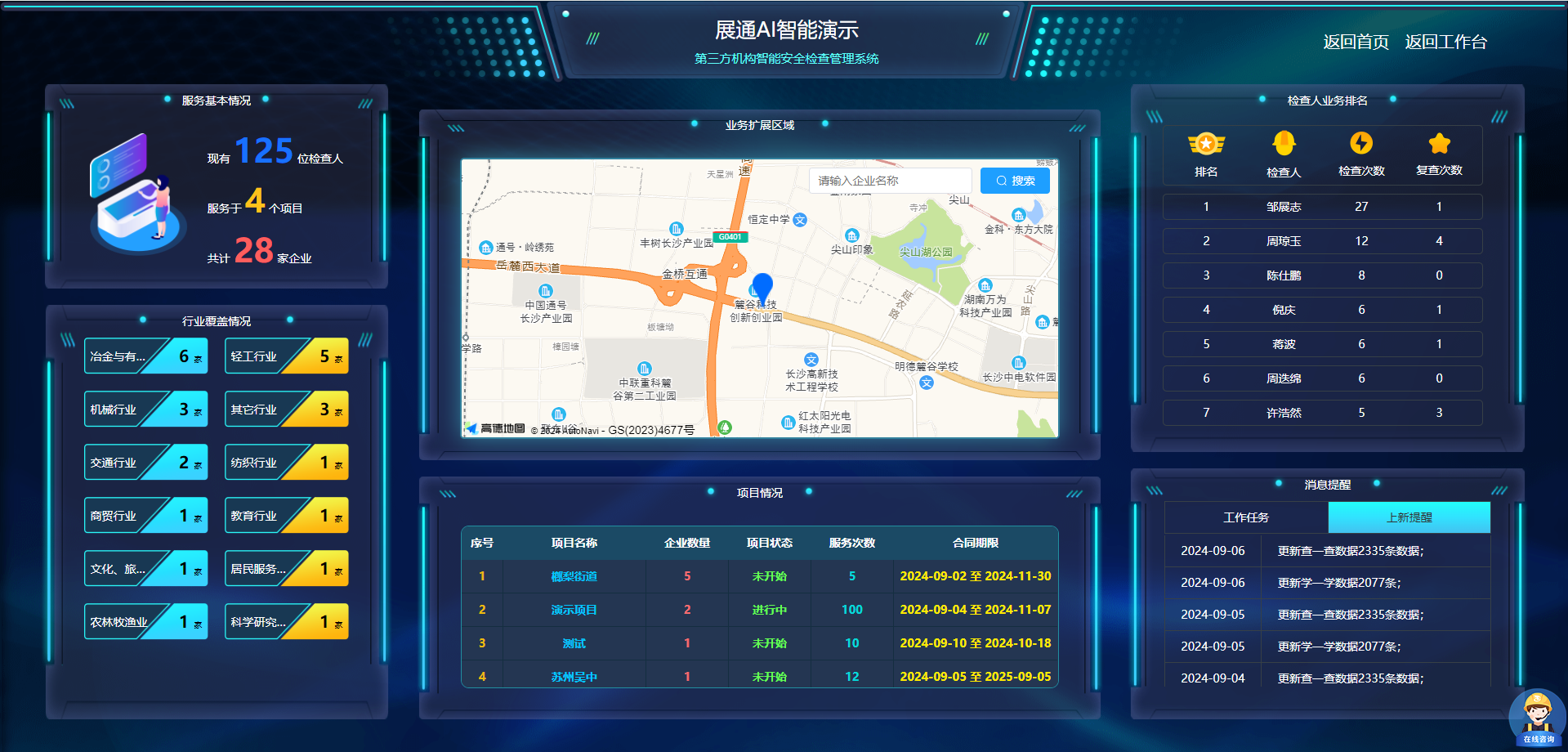 全面整合安全檢查工作業(yè)務(wù)數(shù)據(jù),比如檢查和復(fù)查情況、隱患整改率等統(tǒng)計、企業(yè)安全檢查工作開展排名、人員安全檢查工作執(zhí)行排名、檢查計劃實(shí)施進(jìn)度等一目了然,為有的放矢地開展安全檢查工作提供數(shù)據(jù)支撐。