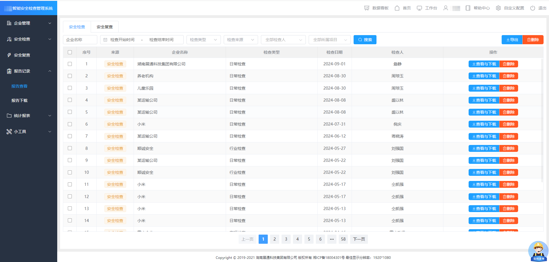 隨時查詢安全檢查記錄,直觀展示檢查企業(yè)、檢查時間、檢查人及對應(yīng)的檢查詳情有效解決紙質(zhì)臺賬儲存空間大容易損壞丟失等問題,支持下載或批量導(dǎo)出報告,方便快捷。