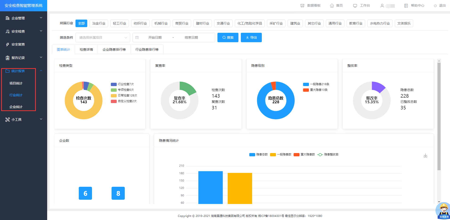 第三方機(jī)構(gòu)版、政府監(jiān)管版支持按行業(yè)、項(xiàng)目及企業(yè)等多維度進(jìn)行安全檢查情況數(shù)據(jù)統(tǒng)計與分析,為負(fù)責(zé)人管理決策提供精準(zhǔn)的數(shù)據(jù)支撐。