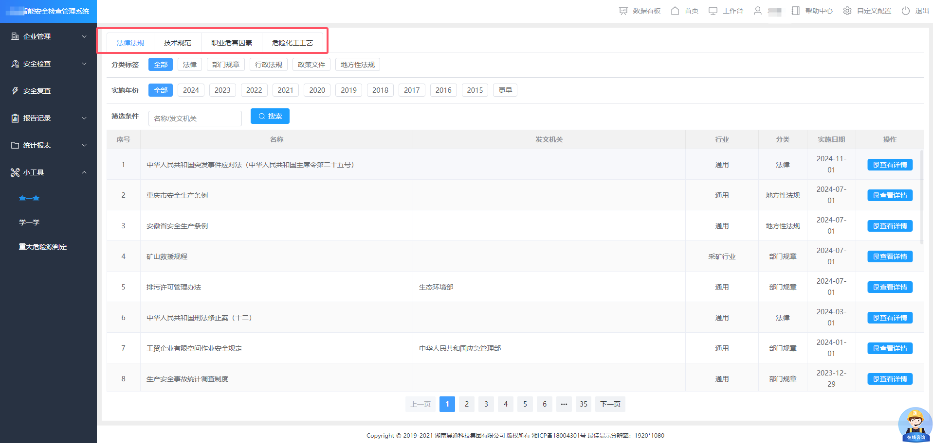 系統(tǒng)內(nèi)設(shè)“查一查”、“學(xué)一學(xué)”功能,提供法律法規(guī)、技術(shù)規(guī)范、危險化工工藝、職業(yè)危害因素、安全知識庫、事故案例庫等便捷查詢,快速輔助安全人開展安全檢查工作,彌補(bǔ)個人專業(yè)知識短板。